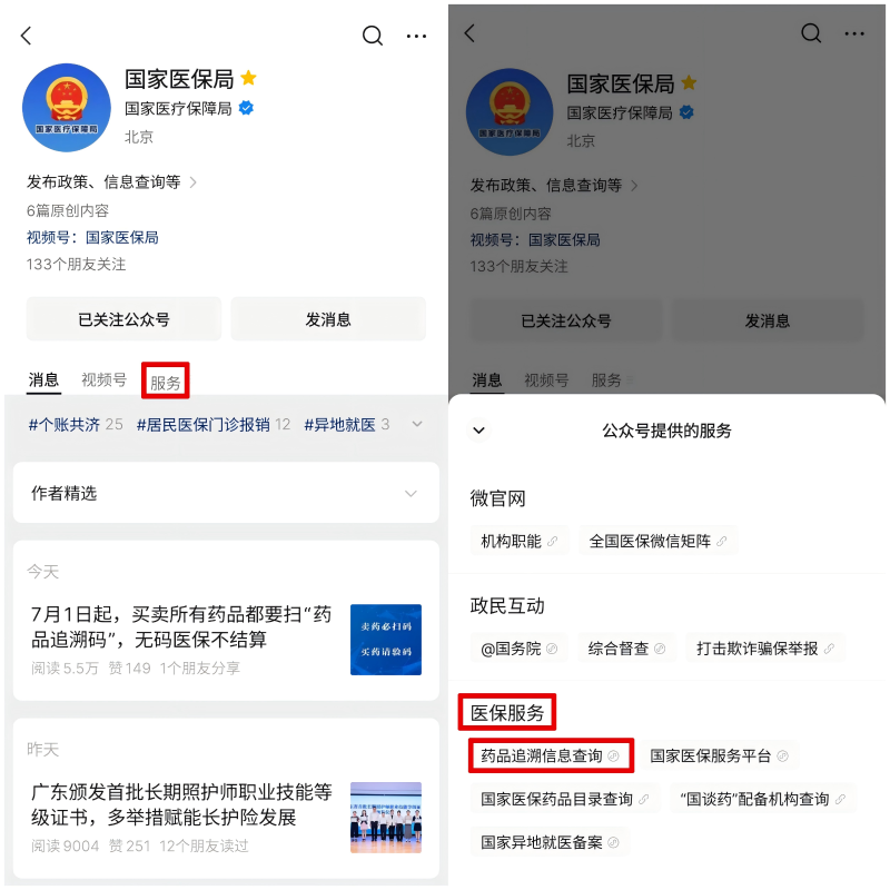 或進入“國家醫保局”微信公眾號消息對話頁,點擊醫保服務→藥品追溯信息查詢,進入查詢頁面。