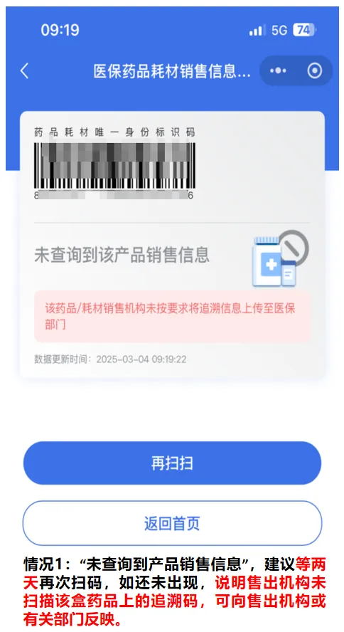 建議等兩天再次掃碼,如還未出現,說明售出機構未掃描該盒藥品上的追溯碼,可向售出機構或有關部門反映。