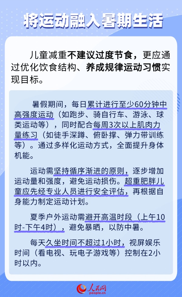 近年來,我國兒童青少年超重肥胖率持續攀升。兒童期肥胖會增加成年后“三高”(高血壓、高血脂、高血糖)、冠心病、肥胖相關癌癥等慢性疾病的發病風險。河南省兒童醫院內分泌遺傳代謝科副主任醫師楊威在接受人民網采訪時表示,暑假期間,超重、肥胖的“小胖墩”可充分利用假期,在保證生長發育的前提下逐步減脂。