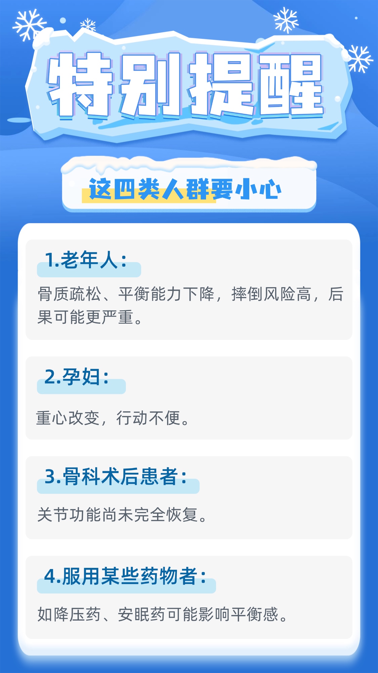 近日寒潮來(lái)襲,雨雪低溫導(dǎo)致路面濕滑,極易引發(fā)摔跤。每年冬雪季,因路滑摔倒導(dǎo)致骨折、扭傷的患者都會(huì)明顯增多。人民網(wǎng)《健康“醫(yī)”點(diǎn)通》欄目采訪了河南省職工醫(yī)院中醫(yī)科·中西醫(yī)結(jié)合科主任醫(yī)師張恒,總結(jié)了一份“雪天防摔秘籍”,助您安穩(wěn)過(guò)冬!