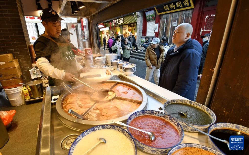 2月18日,游客在北京煙袋斜街品嘗美食。