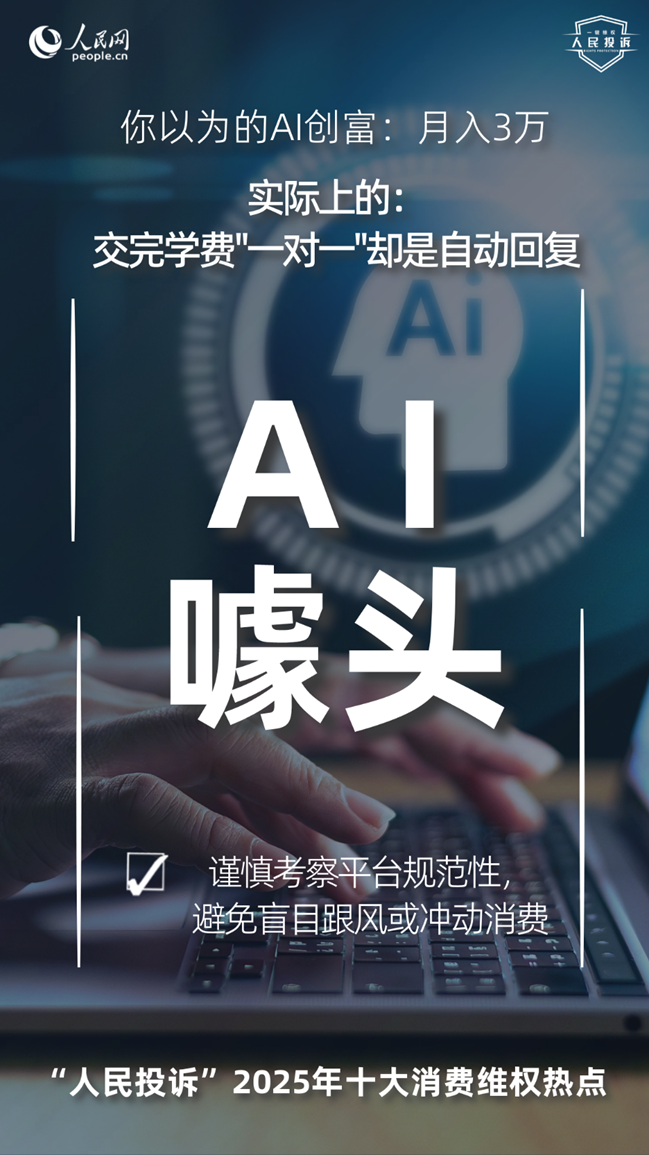 一年一度的“3·15”國際消費(fèi)者權(quán)益日即將到來,保護(hù)消費(fèi)者權(quán)益成為公眾關(guān)注焦點(diǎn)。人民網(wǎng)“人民投訴”平臺基于對2025年平臺投訴案例的剖析發(fā)現(xiàn),去年的消費(fèi)維權(quán)呈現(xiàn)出一些顯著特征,例如AI技術(shù)應(yīng)用伴生新型消費(fèi)風(fēng)險(xiǎn)、數(shù)字場景中的信任機(jī)制面臨考驗(yàn)等。AI造富神話、私域收割、銀發(fā)理財(cái)圍獵……“人民投訴”為你揭開2025年十大消費(fèi)維權(quán)熱點(diǎn)。